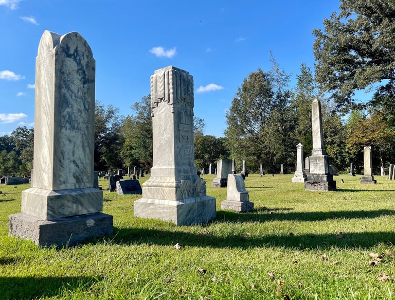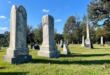 At the last, re-survey of the past burials, performed in the summer of 2002 by Billie and Charlie Clark, there were approximately 553 burial plots with markers. There are many more today.